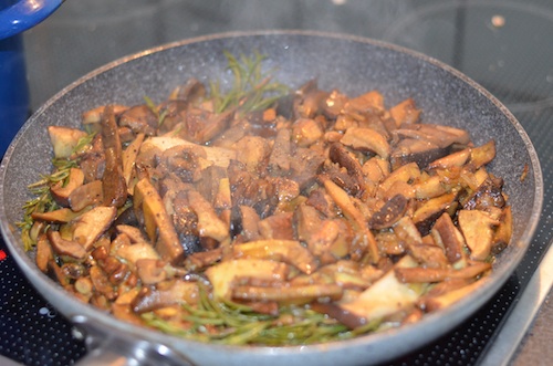 Foto: Da brutzeln die ersten köstlichen Pilze in der Pfanne. Zwei, drei Rosmarinzweige sorgen unter anderem für die Würze. Will man nicht schon direkt reinbeißen? (4 Fotos © Andreas G.)
