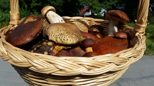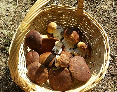 Das Foto rechts zeigt den heutigen Pilzfund meines Vaters, ebenfalls hier in unseren Wäldern. Im Korb liegen Steinpilz, Birkenpilz, Maronen, Hexenröhrling, Rotkappe und Rotfüßchen.