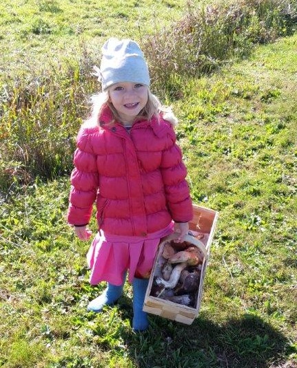 Das große Foto zeigt Leni mit den Pilzen, die wir zusammen gefunden haben. Sieht sie nicht stolz und glücklich aus?