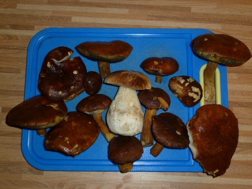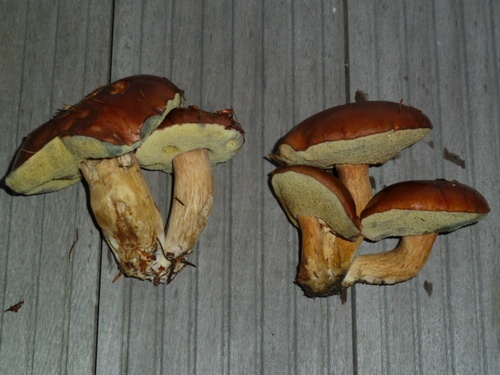 Nach ein paar Minuten kam ich mit zwei stattlichen Exemplaren zurück und fragte, ob sie was taugten. Meiner Frau fielen fast die Augen aus dem Kopf, denn ich hielt, ohne es zu wissen, zwei schöne Steinpilze in den Händen. :-) Danach fand ich noch weitere acht.