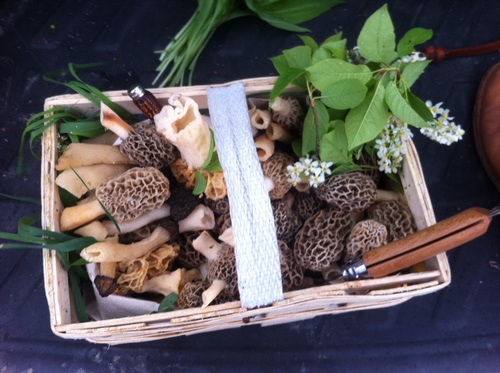 Foto: Ein wunderschöner Korb mit einigen Käppchenmorcheln und Speisemorcheln in Graubraun und Goldgelb. Dazu gibt es, wie es sich für einen bayerischen Schwammerlkorb gehört, grünen Schmuck mit einigem Gras, vermutlich Bärlauch (oben) und einem blühenden Zweig der wild wachsenden Traubenkirsche. (Foto © Marie)