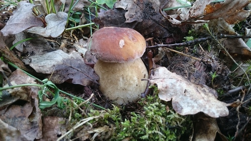 An einer steilen kargen Böschung stand dann doch ein kleinerer Steinpilz. Daraufhin bin ich doch nochmal in den Wald zurück, und siehe da, ich fand noch drei Prachtkerle. Ich habe sie dann in meinem Sport T-Shirt eingewickelt, da ich ja weder Korb noch Messer dabei hatte.