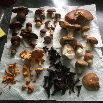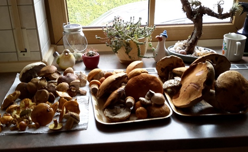 heute waren wir im Wald rund um Murnau erfolgreich. Endlich! Wie das Foto zeigt, fanden wir Flockis, Maronen, Steinpilze, Herbsttrompeten, Pfifferlinge und Duftleistlinge (im Uhrzeigersinn).