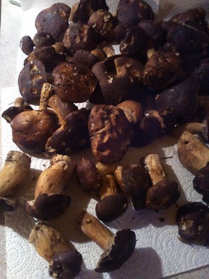 Es gibt zur Zeit sooooo viele Maronen, dass man gar nicht alle mitnehmen kann. Heute erntete ich nur die größten, ließ geschätzte 80 Exemplare stehen. Außerdem fand ich einen Steinpilz, einen Safranschirmling und einige Perlpilze.