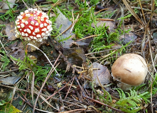 2 Fotos: »Ist er nicht wunderschön?« fragt Julia und meint den erhabenen Fliegenpilz. Ja, er stellt mit seiner Ausstrahlung die letzten gefundenen Maronenröhrlinge des Jahres (rechts) in den Schatten. Weshalb wir ihnen nur ein kleineres Bildformat einräumen. (2 Fotos © Julia)