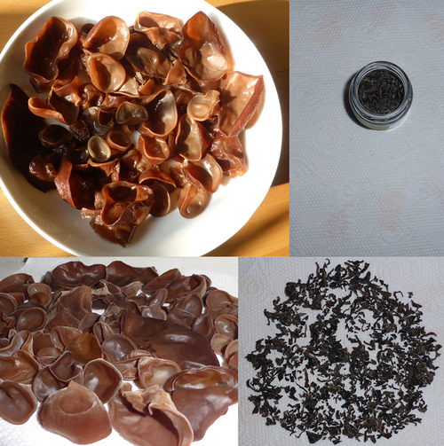 Collage: Links sehen wir zwei Fotos mit frischen, rechts zwei mit getrockneten (und kleingeschnittenen) Judasohren. Auch wenn sie beim Trocknen noch so schrumpfen, beim Einweichen erreichen sie wieder ihre Ursprungsgröße und ihr Ursprungsgewicht. Auch wenn sie keine Geschmacksweltmeister sind, so sind sie doch sehr gesunde Suppen- und Soßenpilze. (Collage/4 Fotos © Michael)