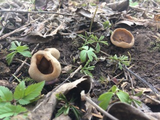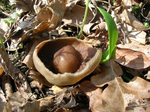 2 Fotos: Anemonenbecherlinge (links) parasitieren an den feinen Wurzeln von Buschwindröschen. Sie werden im Durchmesser ein bis drei Zentimeter groß und sind ungenießbar. Rechts eine Böhmische Verpel mit entarteter Wachstumsform. (3 Fotos © Jürgen)