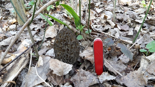 Foto: Eine besonders feiste Spitzmorchel, die im humusreichen Boden wohl eines Auwaldes prima gedeiht, im Größenvergleich neben Christians Pilzmesser. (2 Fotos © Christian)