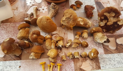 »Habe heute wieder einen Abstecher in den Wald bei Triftern gemacht. Gefunden habe ich 21 Sommersteinpilze auf einem Fleck, eine Rotkappe ,ein paar Maronen, Birkenpilze und Pfifferlinge.