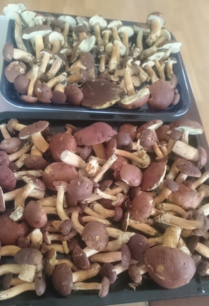 haben, Pfifferlinge, fünf große Steinpilze, Goldröhrlinge, Maronen, Große Gelbfüße (Kuhmäuler), Fichtenreizker und sogar 15 Edelreizker im Kiefernwald. Darüber