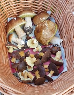 Nach einer Stunde war unser Pilzkorb voll und die Ausbeute konnte sich sehen lassen. Neben Steinpilzen und Maronen gab es viele Schirmlinge, Reizker, Anisegerlinge und den Porphyrröhrling*.