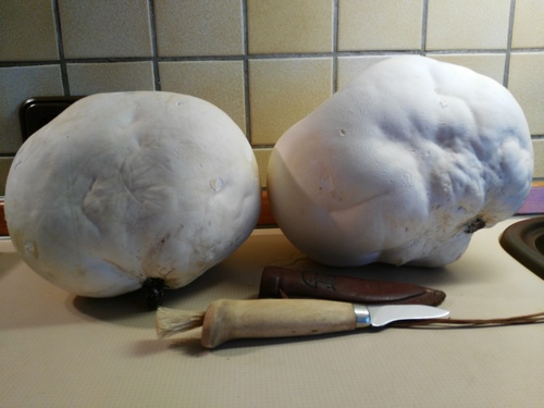 Foto: Die zwei Riesenboviste, zusammen 2 Kilo schwer, bescheren Ernst morgen einen Schnitzeltag. Weil ein einziger Riesenbovist einer ganzen Familie ein komplettes kostenloses Essen liefern konnte, wurde der Pilz im Kaiserreich volkstümlich auch »Beamtenschnitzel« genannt. (Foto © Ernst)