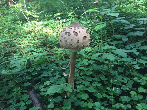 Foto: Ein Parasol im Hasenklee. Aus Freude über seinen unerwartet guten Fund mit einem tollen Riesensteinpilz ließ ihn Jörg stehen.