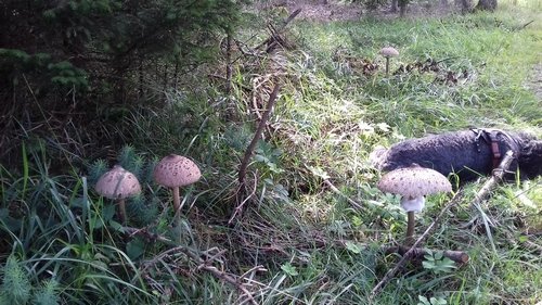 Foto: Marias Leo passt schön auf die vier Parasole auf. Auch für ihn sind die Temperaturen endlich wieder erträglicher. Bei jedem Pilzgang von Frauchen ist er mit Herz und Seele dabei. (Foto © Maria)