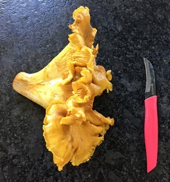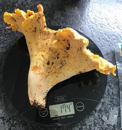 2 Fotos: Stolze 174 Gramm brachte der größte Pfifferling auf die Waage. Dabei dürfte es sich um das Exemplar ganz unten auf dem Foto im Wald handeln. Auf dem Bild rechts sehen wir, wie klein sich das Kartoffelschälmesser gegen den Koloss ausnimmt.