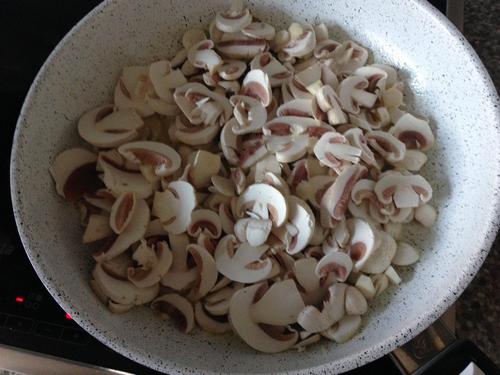 Foto: Und ab in die Pfanne mit den geschnittenen Champignonscheiben! (2 Fotos © Andrea)