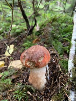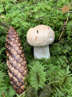 2 Fotos: Während es der Steinpilz (links) mehr mit dem Fichtenzapfen hat, steht die Rotkappe (rechts) mehr auf Birke: es ist ziemlich sicher eine Birkenrotkappe.