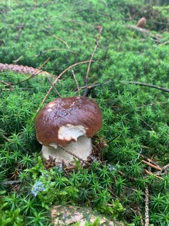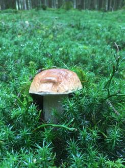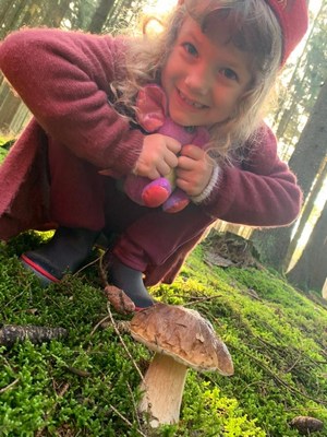 Gefunden haben wir wieder viele Steinpilze (zwei Fotos rechts, oben mit Armins Tochter), Flockenstielige Hexenröhrlinge und einige Rotkappen. Maronenröhrlinge und Birkenpilze gibt's zurzeit auch sehr viele, die ließen wir aber im Wald, da unser Korb schon mehr als voll mehr.
