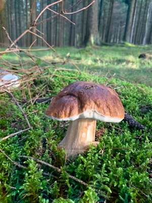 2 Fotos: Waren das Prachtkerle von Steinpilzen, die Hans aus dem Moos gehoben hat! Wie gut, dass er den Wald dem Oktoberfest vorzieht.
