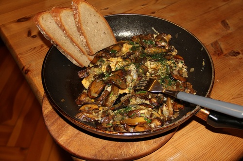 Foto: Die erste Pilzpfanne des Jahres ist doch immer »ein echter Gaumenschmaus«, wie Zeljko schreibt. Es gab sie mit Eiern, Zwiebeln, Petersilie und einigen Scheiben Brot. (Foto © Zeljko)