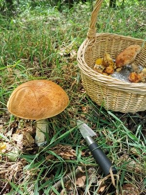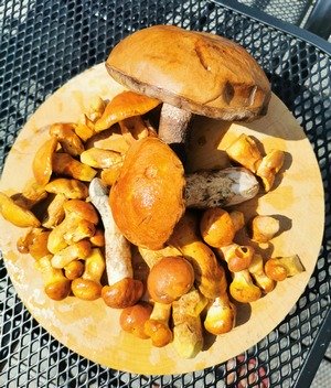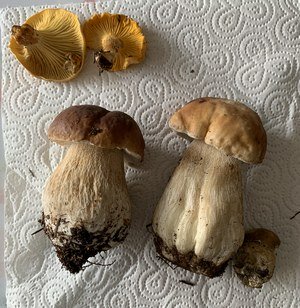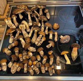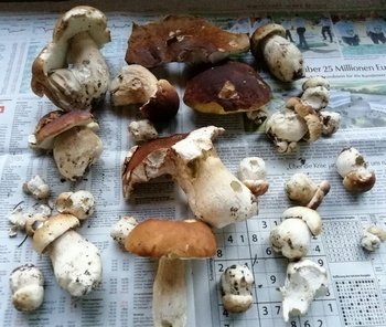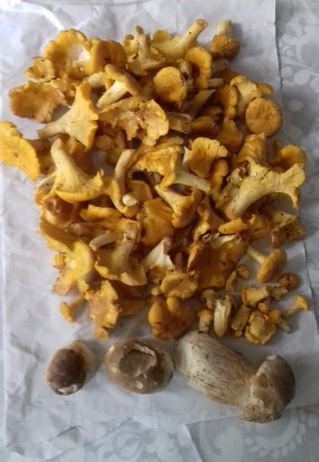 Heute habe ich mich endlich aufgerafft und zwei Wälder inspiziert. Es war mein erster Pilzgang ohne meinen verstorbenen geliebten Vierbeiner Leo. Das Ergebnis kann sich sehen lassen (Foto rechts). So durfte ich mich vor allem über Pfifferlinge freuen. Die Steinpilze sehen zwar nicht sonderlich schön aus, waren aber knackig und madenfrei.