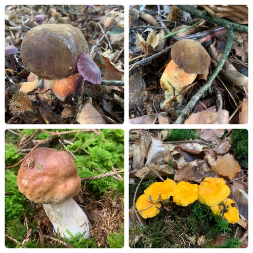 Collage: Und noch einmal ein umfassender Eindruck vom Pilzwachstum bei Triftern. Beinahe bestrickend, wie sich oben links der Lila Lacktrichterling an den Flocki ranschmeißt. Rechts davon ein weiterer Flocki, unten links ein schöner Steinpilz und rechts von ihm eine kleine Reihe leuchtender Pfifferlinge. Ein sehr schöner Gesamtfund für Armin!