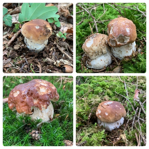 Collage: Und auf einmal sind sie wieder da, die Steinpilze! An diesen vier Bildern zeigt sich deutlich, dass sie jung, also die Vorreiter eines neuen, des ersten Oktoberschubes sind. Herrlich! Und Armin sendet uns erstmals schön geordnete Collagen, deren Einzelfotos uns einen erweiterten Einblick in das aktuelle Wachstum ermöglichen.