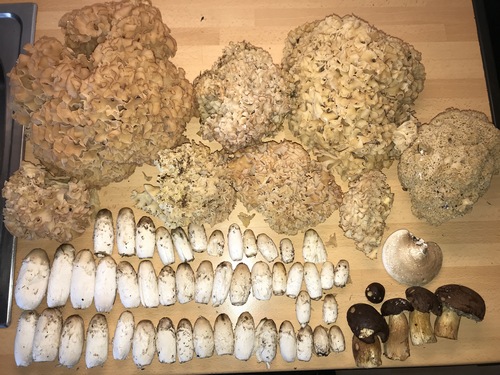 Fazit: Es wachsen viele Pilze, darunter auch beste Speisepilze. Von einem guten Dutzend Krauser Glucken waren noch einige Exemplare im genießbaren Zustand. Zusätzlich landeten fünf Maronen und 47 Schopftintlinge direkt mittags in der Pfanne. Auch ein frischer Birkenporling wurde zum Trocknen mitgenommen.