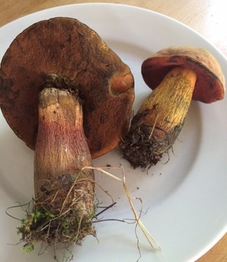 Gestern sah ich auf dem Grünstreifen den großen Netzstieligen Hexenröhrling auf dem Foto. Da war er nicht mal halb so groß und der Hut lag noch kugelig an. Heute war er umgeworfen und da dachte ich, dass ich ihn doch lieber mitnehmen sollte. In einer anderen Seitenstraße stieß ich dann auf drei große Exemplare und den kleinen auf dem Foto, bei dem ich einfach nicht widerstehen konnte - ehe er irgendwelchen Vandalen zum Opfer fällt.
