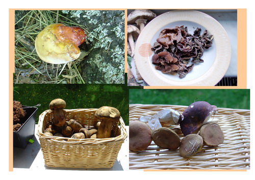 Foto: Ausgerechnet den nicht alltäglichen Glänzenden Lackporling (links oben) schnappte sich ein Konkurrent. Immerhin konnte sich Heinz noch über Judasohren (daneben) und über ein Körbchen Hexenröhrlinge sowie Rotfußföhrlinge und Speisetäublinge (rechts unten) freuen (Foto © Heinz Karp).