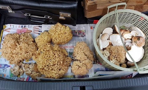 Foto: Eine schöne Ausbeute an Krausen Glucken und an Birkenporlingen hat Ronny gemacht. Er schwärmt vom guten Wintertee der Porlinge. (Foto © Ronny B.)