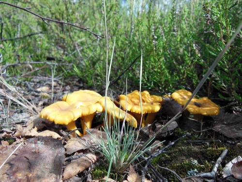 Foto: Sie stehen überall, manchmal sogar in Reih' und Glied, die herrlichen Pfifferlinge; in den Kiefernschonungen, im Moos, auf lichten Waldwegen oder, wie hier, im Heidekraut. Schön hat Helga den kleinen stolzen Trupp in Szene gesetzt!