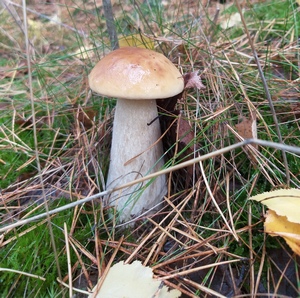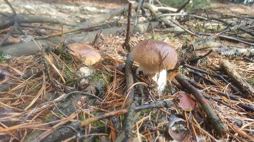Detlef kam gleich mit sechs großen Steinpilzen aus den jungen Eichen und dann kamen im Kiefernbestand noch die anderen dazu. Es gab ein Gewimmel von kleinen jungen Maronen. Unser Korb füllte sich schnell und so legten wir einer anderen Pilzsammlerin noch Hände voll in ihren Korb.