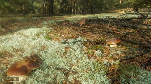 Foto: Vier dicke, fette Steinpize inmitten und am Rand des Bewuchses der Echten Rentierflechte bei Dahme-Heidesee. Ein Motiv, wie wir es selten zu sehen bekamen. (4 Fotos © Detlef)