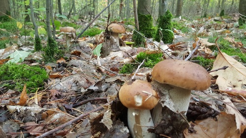 Foto: Ein Steinpilzprospekt von der schönsten Art. Im jungen Eichenwald wachsen vier schöne Steinpilze heran. Wi sich ihre Hutfarbe den Blättern anzugleichen versucht!