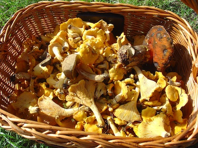 Foto: Ein für die Jahreszeit toller Fund: Dagmars Spankorb, der überquillt von schönen Maronenröhrlingen und teils handtellergroßen Pfifferlingen. Gratulation zu dieser Ernte und dem schönen dekorativen Foto! (Foto © Dagmar S.)