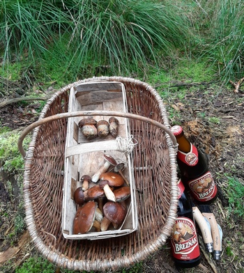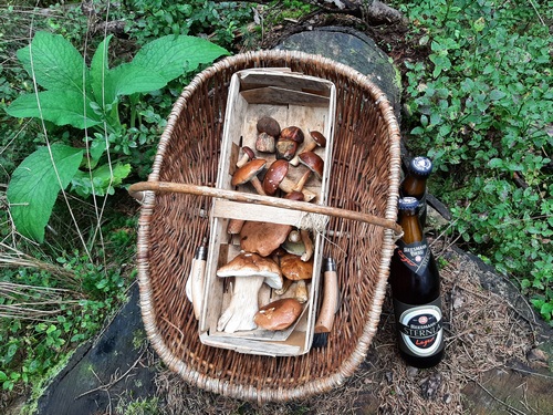 Foto: Spezialitäten aus dem Hamburger (im Korb) und aus dem bayerischen Norden (rechts daneben). Die einen aus dem Wald, die anderen aus dem Brauhaus Sternla zu Bamberg. Jede Wette, dass Dirk und seiner Frau nach einem entspannten Pilzgang beides gemundet hat. (Foto © Dirk)