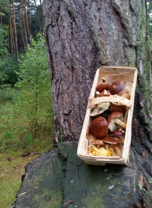 Ich habe mein Sammelergebnis so abgelichtet, dass auch die relativ offene Graslandschaft zwischen den Kiefern in diesem für mich neuen Pilzgebiet zu erkennen ist. In einem guten Pilzjahr mit ausreichend Feuchtigkeit dürfte dieses sicherlich ein wahres Maroneneldorado sein.