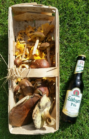 Dieses Mal habe ich einige wenige Maronen, aber wieder etliche Pfifferlinge und zwei schöne Ziegenlippen gesammelt. Abgerundet habe ich meinen ca. zweistündigen Spaziergang mit einer norddeutschen Spezialität aus Mecklenburg, siehe das Foto.