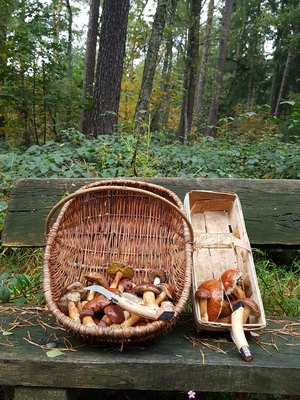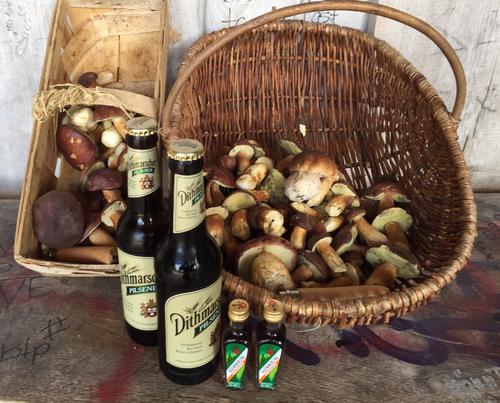 Foto: Einen Steinpilz (im rechten Korb) hatte die Konkurrenz im äußersten Hamburger Westen zurückgelassen, ansonsten fanden Dirk und Mitsammler etliche schöne Maronenröhrlinge. Darauf gab es perlendes und würziges Kulturgut. (3 Fotos © Dirk)