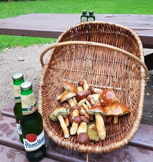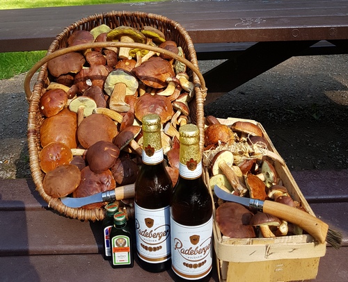 Foto: Einen fantastischen Fund machten Dirk und Mitsammler im Klövensteen. Neben vielen Maronenröhrlingen fanden sie auch 1A-Ziegenlippen. Mit einer bundesweit bekannten sächsischen Spezialität und einer Magenfreude aus Wolfenbüttel wurde der Pilzgang beschlossen. (3 Fotos © Dirk)