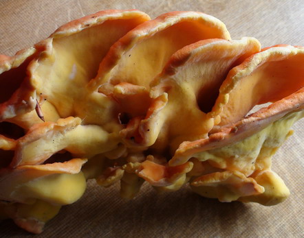 Foto: Frisch und duftig schaut er aus, der Schwefelporling, den Wieland gefunden und zu köstlichen Schnitzeln verarbeitet hat. (Foto © Wieland)