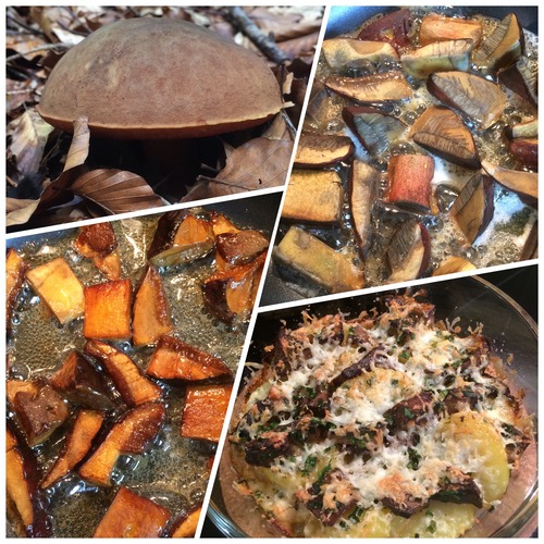 Foto: Monikas Flockenstieliger Hexenröhrling im Buchenlaub - und was aus ihm geworden ist. Die Bilder verdeutlichen: schon aus einem einzigen Pilz lässt sich etwas Leckeres zaubern! (Collage/4 Fotos © Monika)