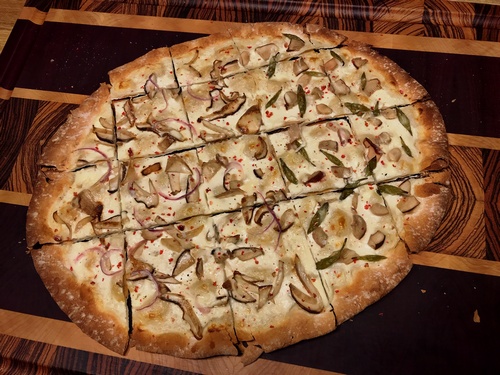 Dieser Flammkuchen war super lecker, vor allem die Hälfte mit den Täublingen und den eingelegten Bärlauchknospen.