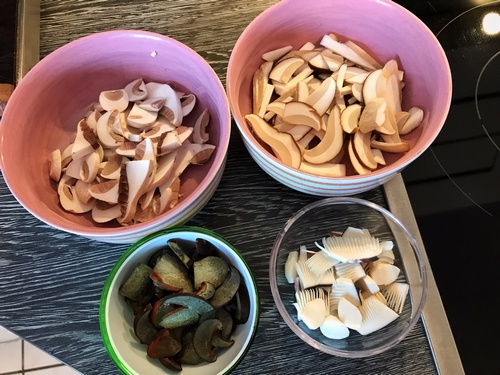 Die großen Pilze mit schon deutlich dunklen Lamellen blieben stehen und zuhause habe ich dann nochmal ein paar aussortiert. So blieben immerhin noch 500 Gramm, wovon ich mir heute aus Zeitgründen erstmal einen Teil frisch