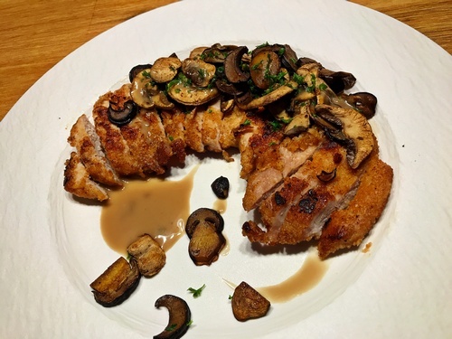 Foto: Ganz bürgerlich und bodenständig - und einfach spitzenmäßig schaut auch das Schnitzel für Stefans Frau aus, das mit Wiesenchampignons und Flockenstieligen Hexenröhrlingsscheiben eine kräftige Pilznote erhielt.