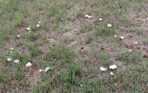 Foto: Ein typischer Hexenring von Wiesenchampignons. Sie gehören als Saprobionten, also Folgezersetzer, mit zu den allerersten Pilzen, die nach langer Trockenheit mit hohen Temperaturen und auslösendem ausreichendem Regen erscheinen. Ich weise zum Thema Trockenheit - Regen - Pilzwachstumsbeginn immer wieder gerne auf das sehr gehaltvolle Interview mit Peter Karasch hin. (Foto © Peter)