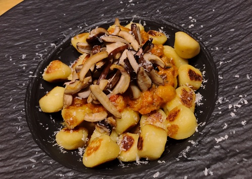 abgeschmeckt (Geschmacksträger für die Pilze), dazu Gnocchi goldbraun in