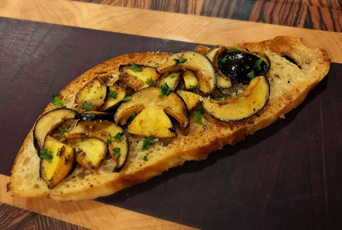 Foto: Ein von seiner Frau selbst gebackenes goldbraun gebratenes Ciabattabrot mit Anhängselröhrlingen gab es im Hause Stefan zum erstenmal. Er schwärmte von den Pilzen und dem Gesamtgeschmackserlebnis. (4 Fotos © Stefan)