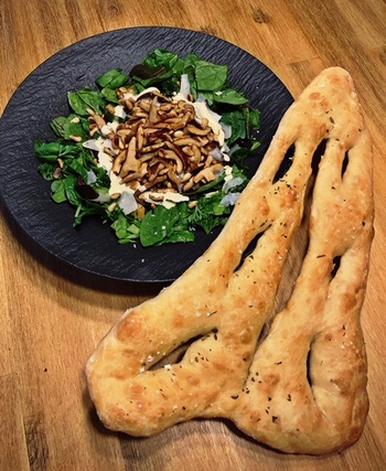 einem frischen Fougasse (eine Brotart aus der Provence) von meiner Frau. Zu sehen auf dem 2. Foto rechts.
